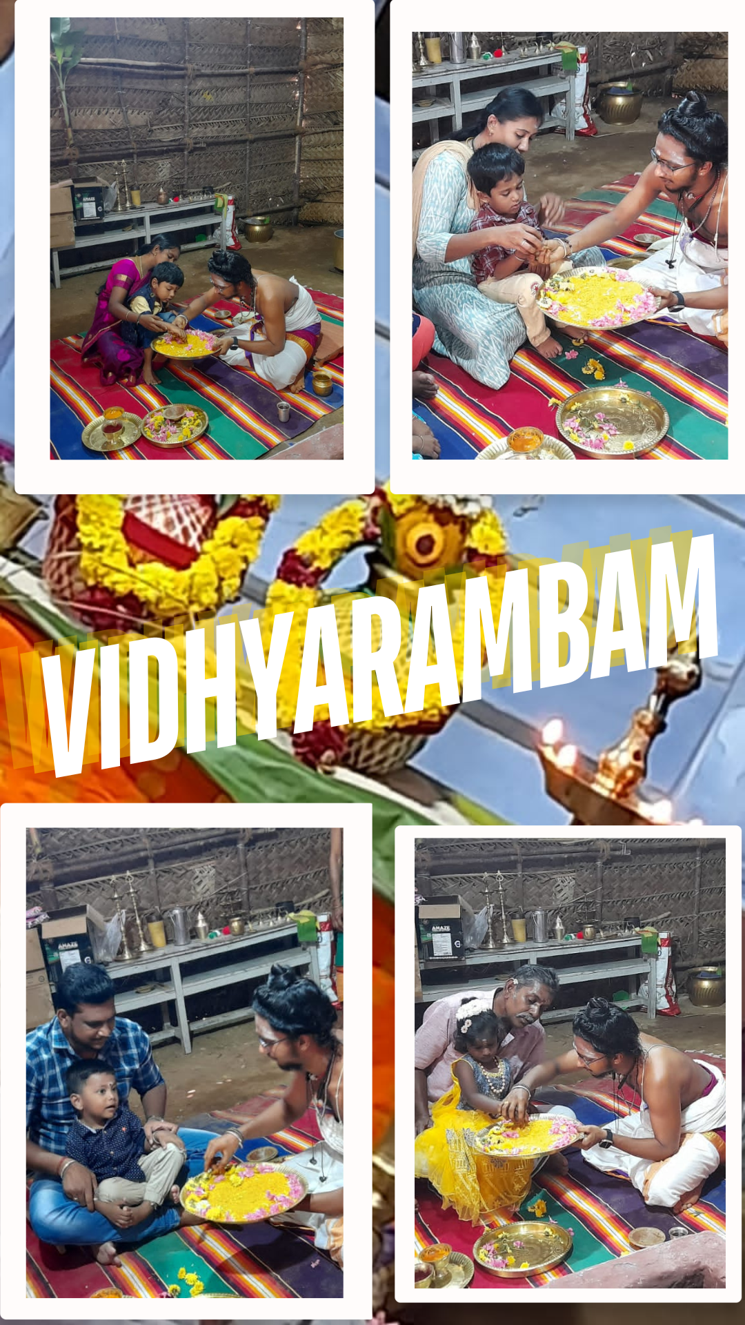 During the celebration, we conduct a special ceremony where children are encouraged to write their first letters or numbers on a plate of rice or sand, symbolising the start of their educational journey. The child is seated on the lap of a revered person, a priest or their parents. The child’s hands are placed on a plate of rice or sand. The priest writes the mantra “Om” and the alphabet on the child’s hand with the child’s finger.The child is then motivated to write or draw on the rice